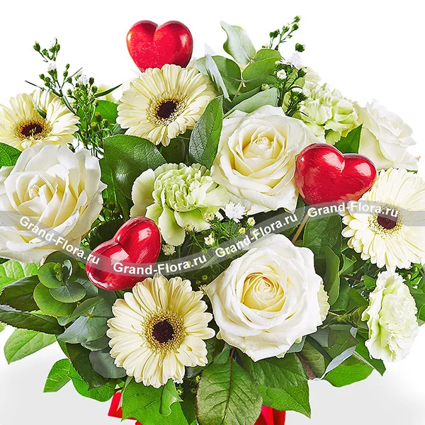 ДЕЛЮКС: роза белая - 11 шт., гербера кремовая - 6 шт., гвоздика зеленая - 4 шт., рускус - 3 шт., гипсофила - 2 шт., эвкалипт - 2 шт., сердце красное (декоративное) - 3 шт., упаковка, бант красный. Примерный размер: 45Х45 см.
